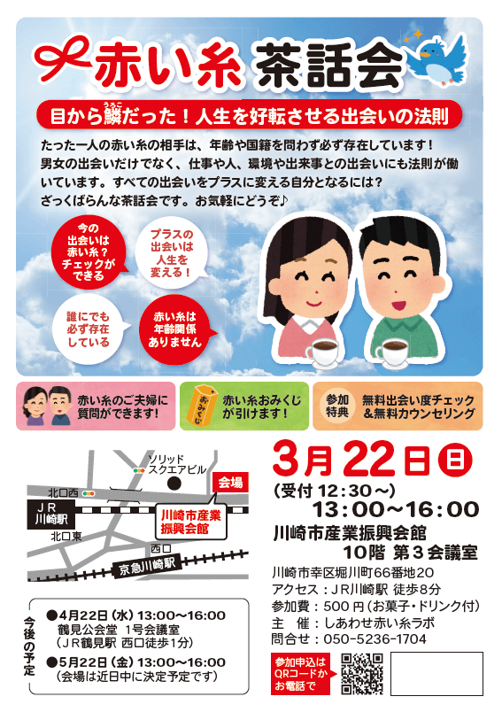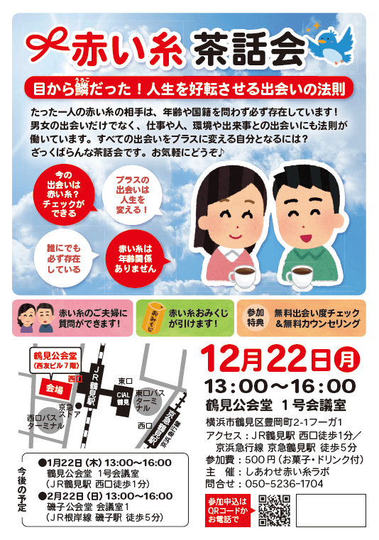 茶話会の中では赤い糸夫婦によるミニセミナー、質問交流もあります。ミニセミナーはオンライン(ZOOM 13時30分〜15時)でも参加可能です。