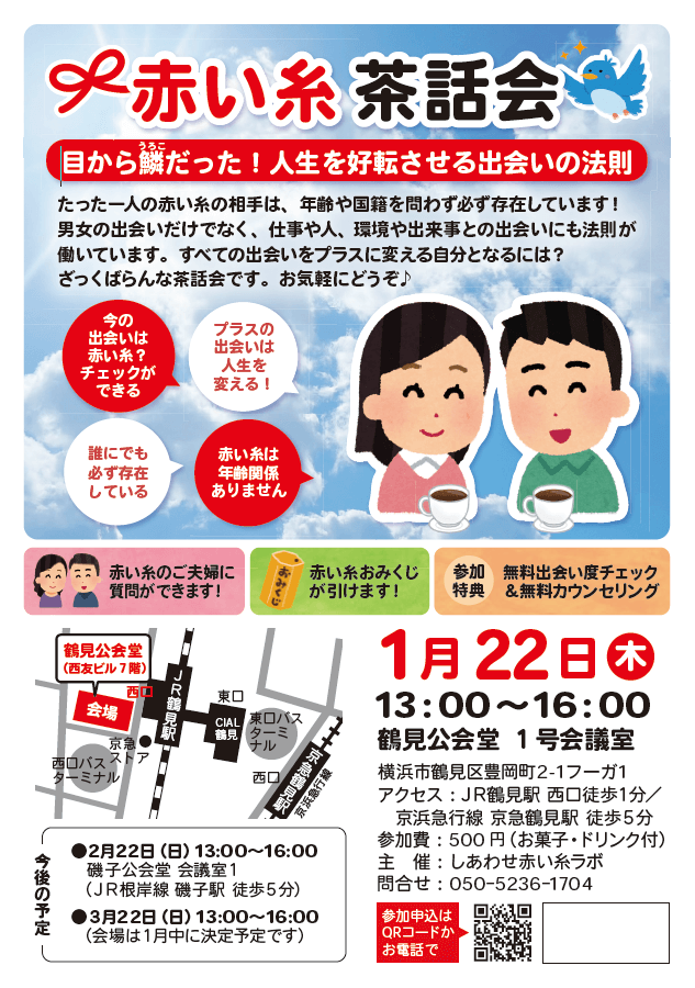 茶話会の中では赤い糸夫婦によるミニセミナー、質問交流もあります。ミニセミナーはオンライン(ZOOM 13時30分〜15時)でも参加可能です。